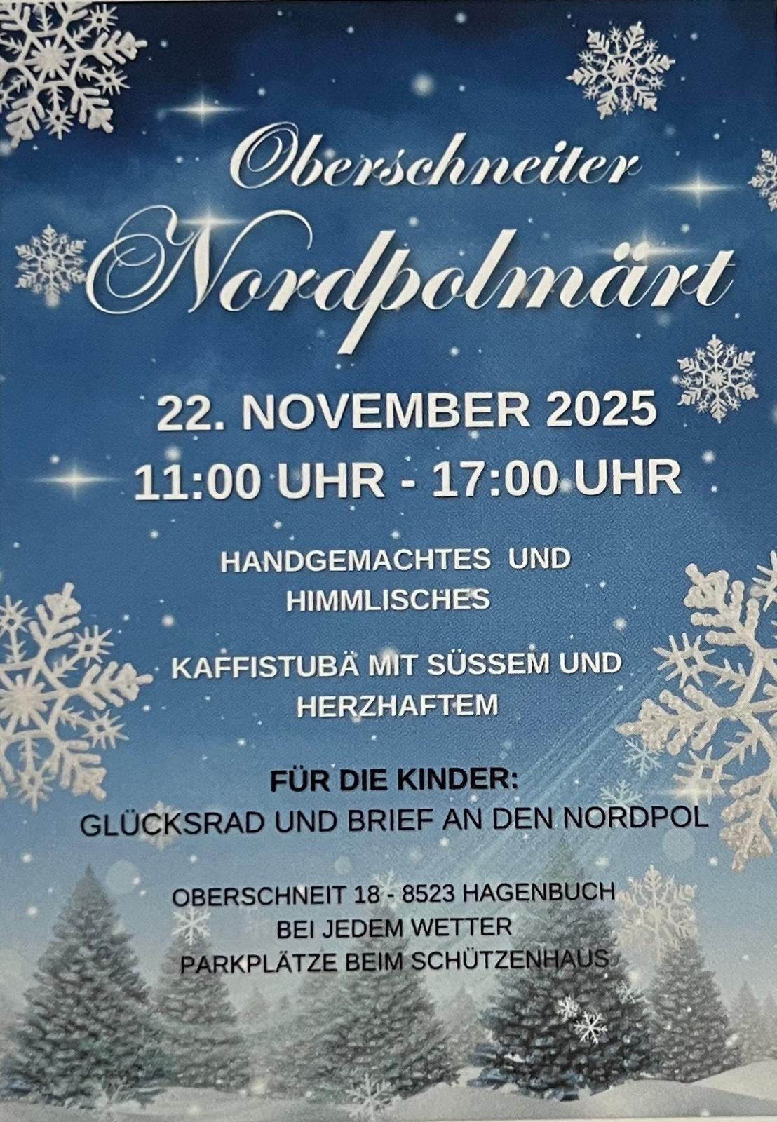 Der liebevoll gestaltete Nordpolmärt mit 14 Ausstellern welche ein handgemachtes und himmlisches Angebot bereit haben. Eine Kaffistube mit Herzhaftem und Süssem. Für Kinder steht ein Glücksrad und ein Briefkasten an den Samichlaus am Nordpol parat. Parkplätze sind beim Schützenhaus Hagenbuch vorhanden. Der Nordpolmärt findet bei jedem Wetter statt. Wir freuen uns auf Ihren Besuch.