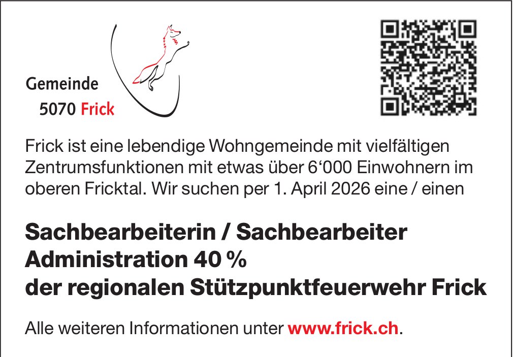 Sachbearbeiterin / Sachbearbeiter Administration 40 % der regionalen Stützpunktfeuerwehr Frick, Gemeinde Frick, gesucht