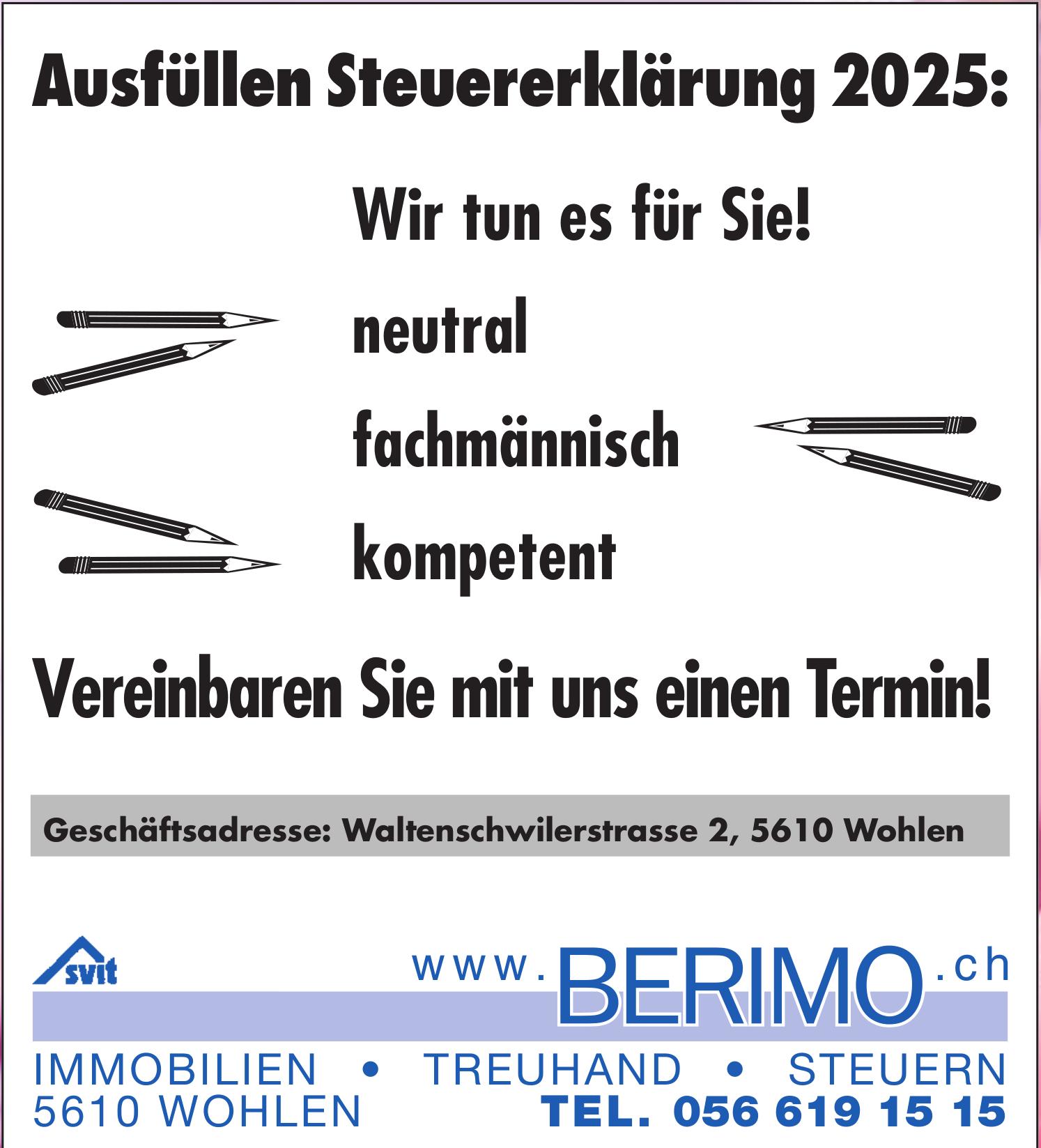 Berimo AG, Wohlen - Ausfüllen Steuererklärung 2025: Wir tun es für Sie! neutral, fachmännisch, kompetent