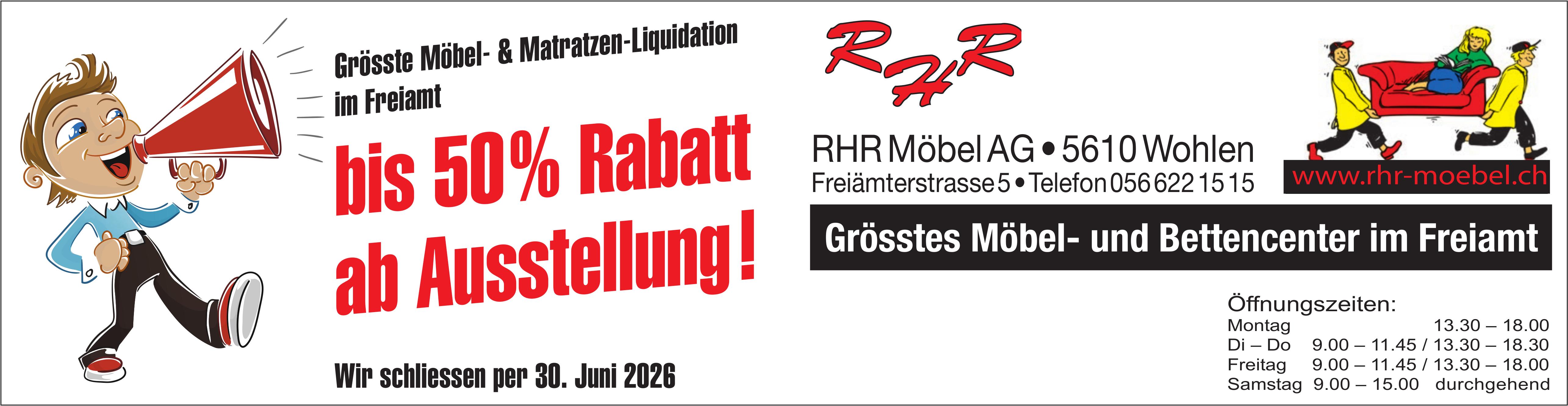 RHR Möbel AG, Wohlen - Grösste Möbel- & Matratzen-Liquidation im Freiamt bis 50% Rabatt ab Ausstellung!