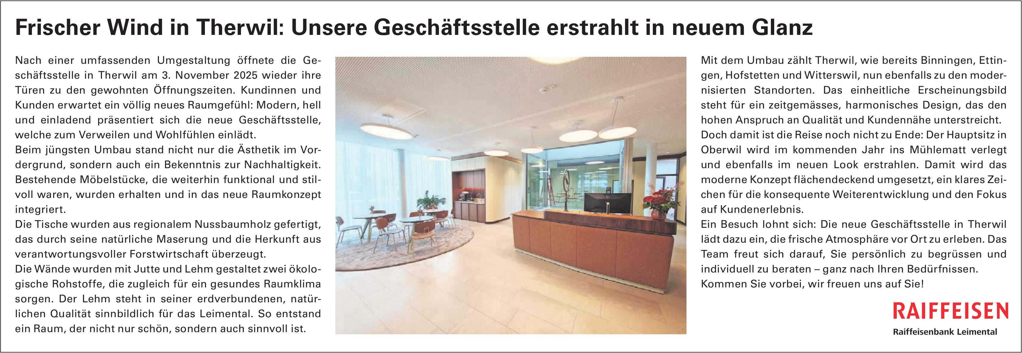 Raiffeisenbank Leimental, Binningen - Frischer Wind in Therwil: Unsere Geschäftsstelle erstrahlt in neuem Glanz