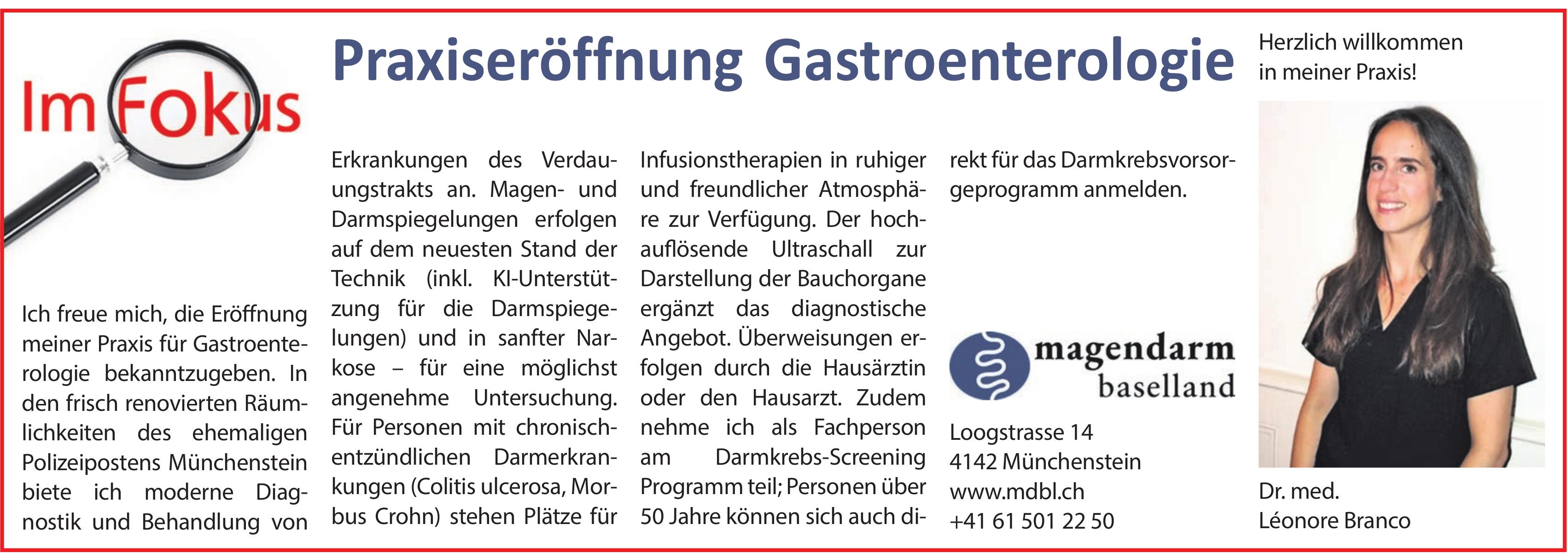 Dr. med. Léonore Branco, Münchenstein - Praxiseröffnung Gastroenterologie