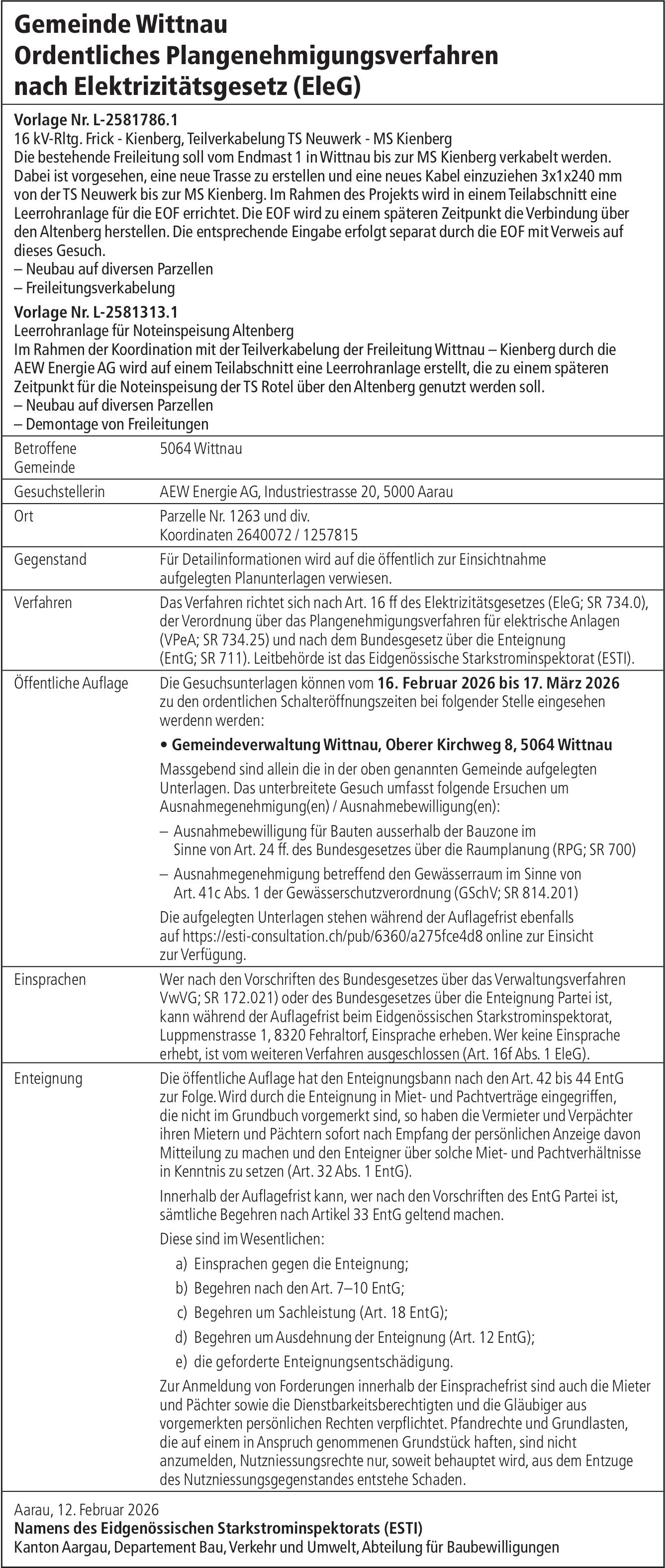 AEW Energie AG, Wittnau - Ordentliches Plangenehmigungsverfahren nach Elektrizitätsgesetz (EleG)