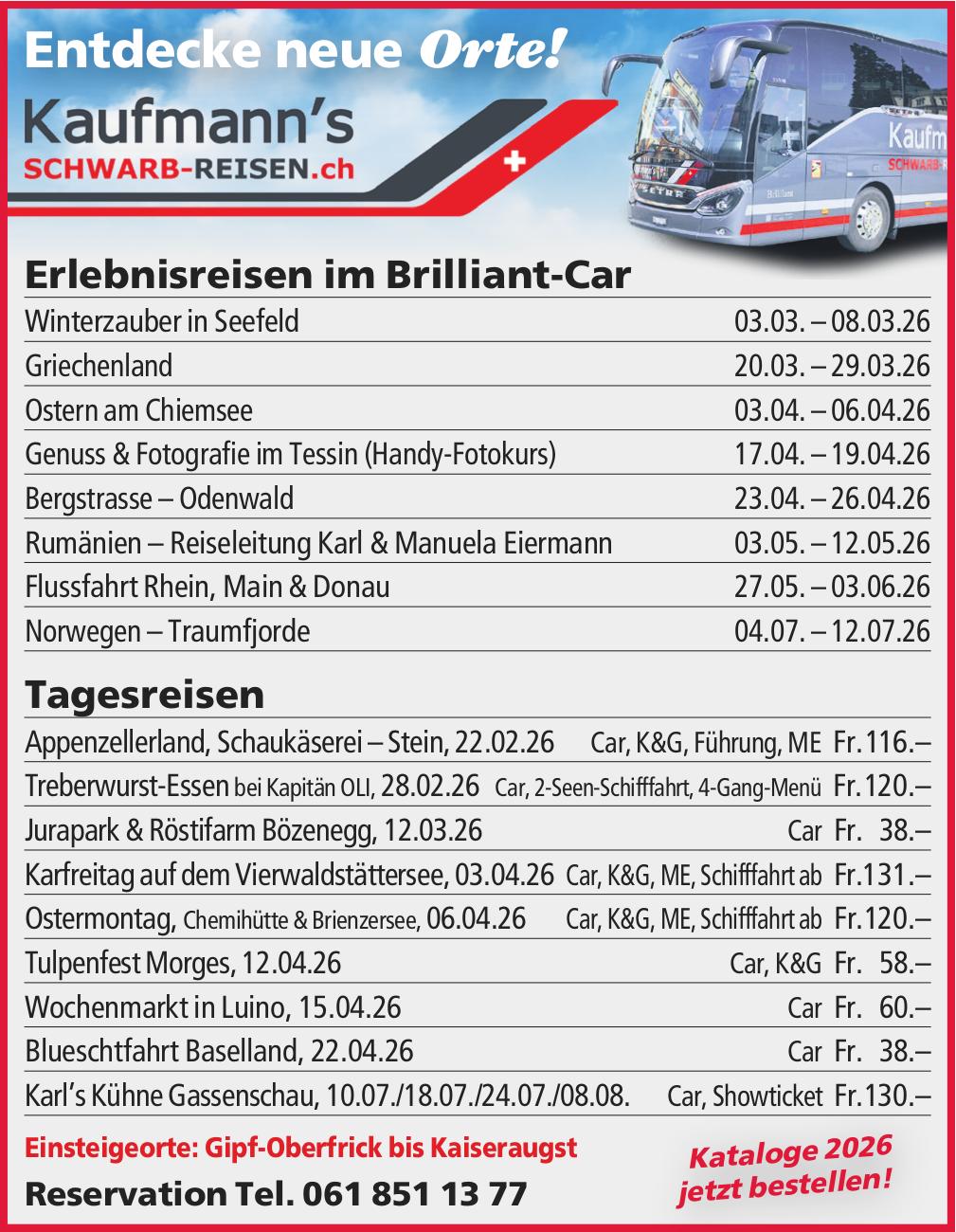 Kaufmann’s SCHWARB-REISEN, Erlebnisreisen im Brilliant-Car