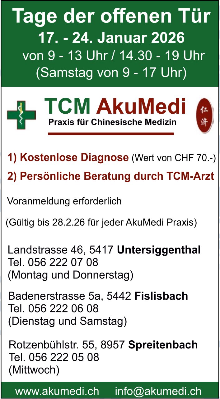 Tage der offenen Tür, 17. bis 24. Januar, TCM AkuMedi, Untersiggenthal, Fislisbach und Spreitenbach