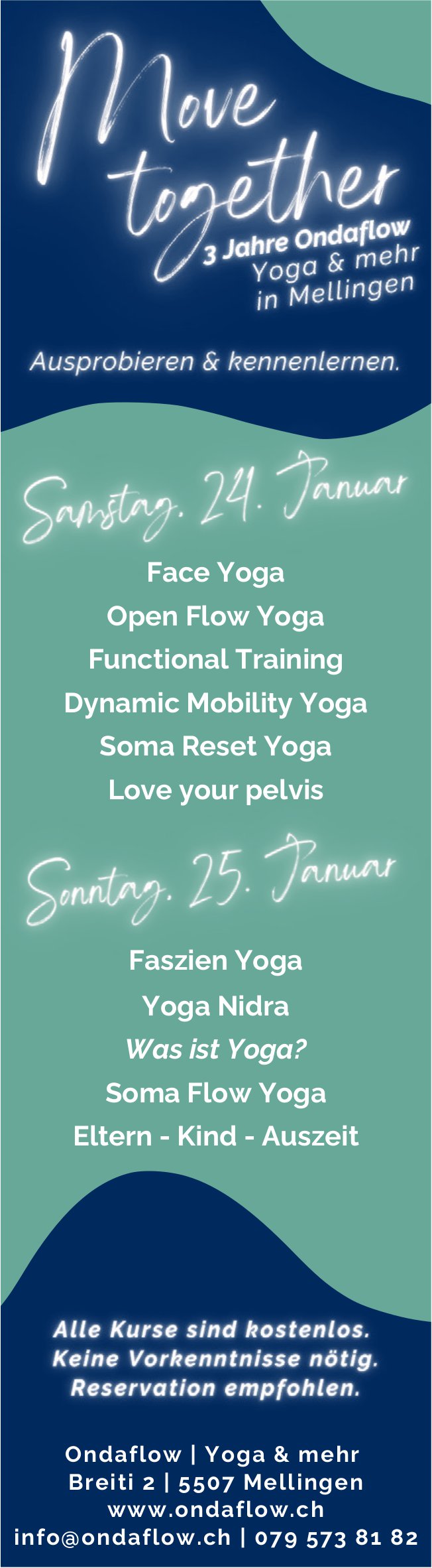 Kurse zum ausprobieren & kennenlernen, 24. und 25. Januar, Ondaflow Yoga & mehr, Mellingen