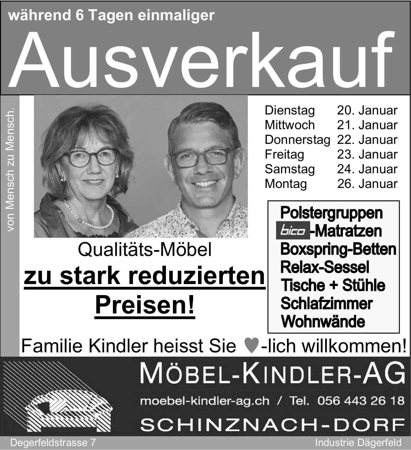 Ausverkauf, 20. bis 26. Januar, Möbel Kindler AG, Schinznach-Dorf