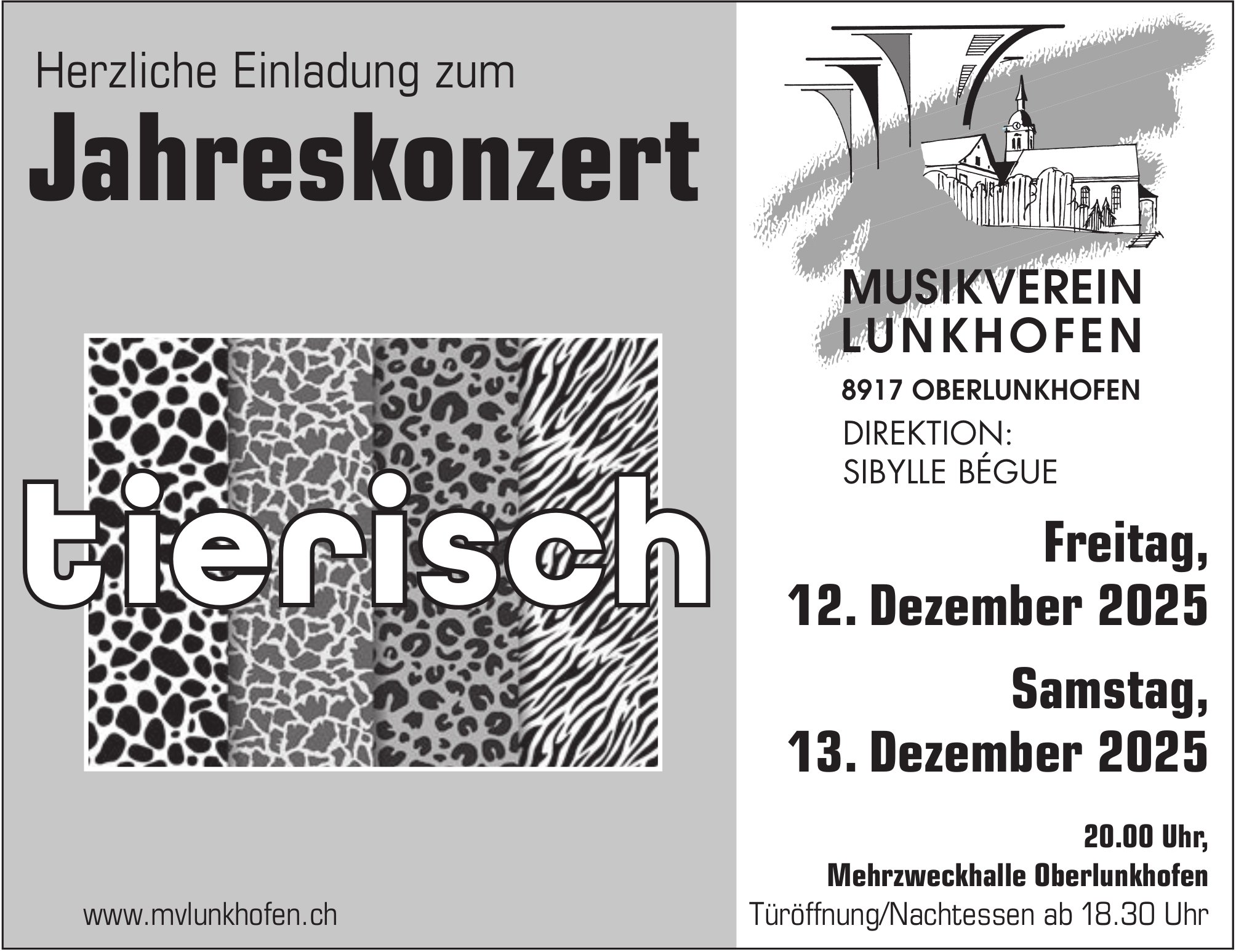 Jahreskonzert "tierisch", Musikverein Lunkhofen, 12./13. Dezember, Mehrzweckhalle Oberlunkhofen