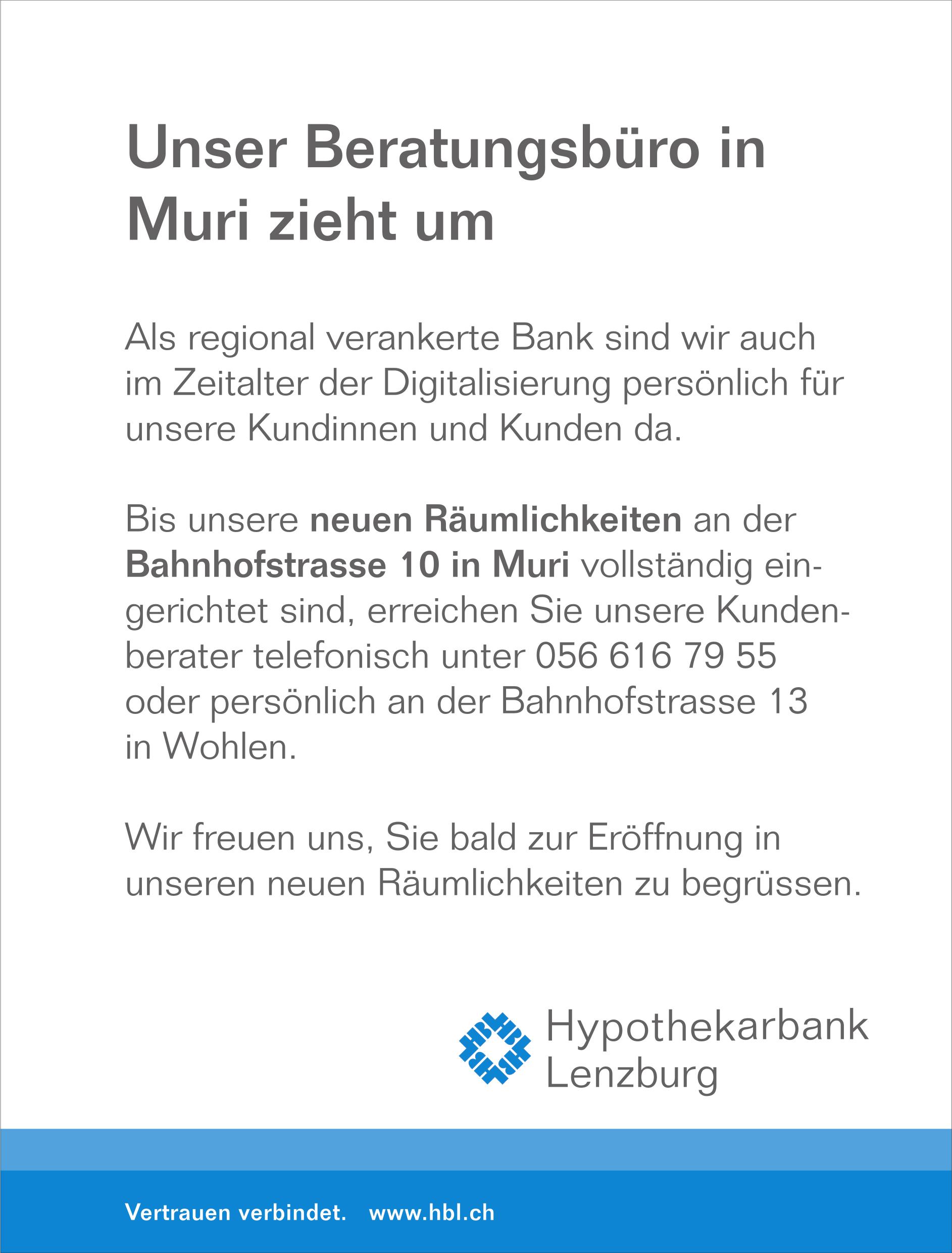 Hypothekarbank Lenzburg, Muri - Unser Beratungsbüro in Muri zieht um