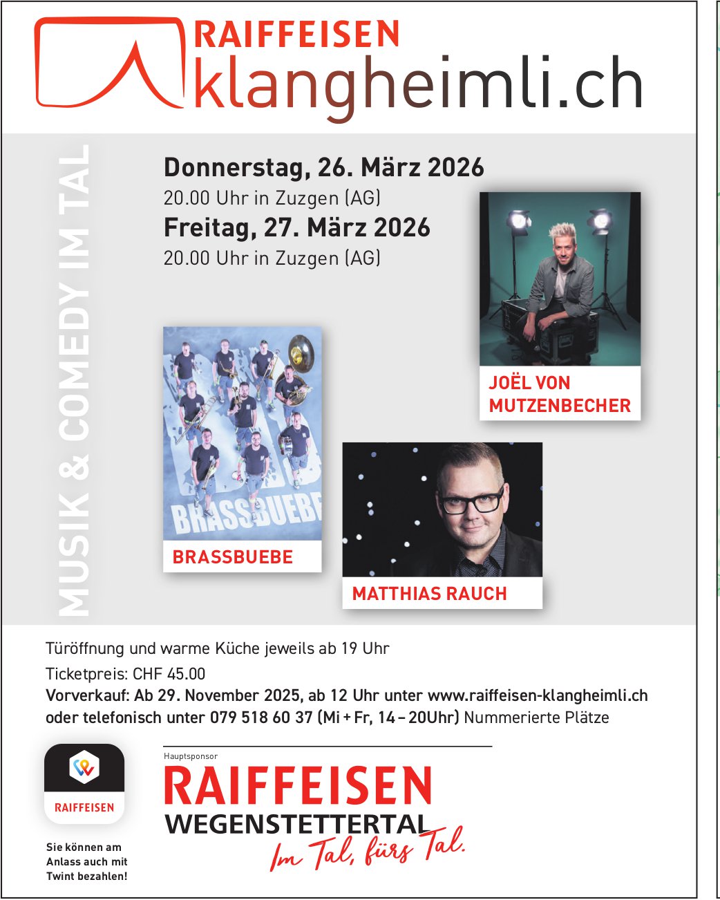 MUSIK & COMEDY IM TAL, 26. - 27. März, Zuzgen