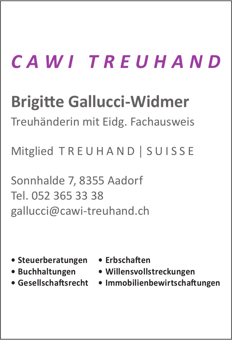 Cawi Treuhand, Brigitte Gallucci-Widmer, Aadorf - Steuerberatung, Buchhaltungen, Gesellschaftsrecht, Erbschaften...