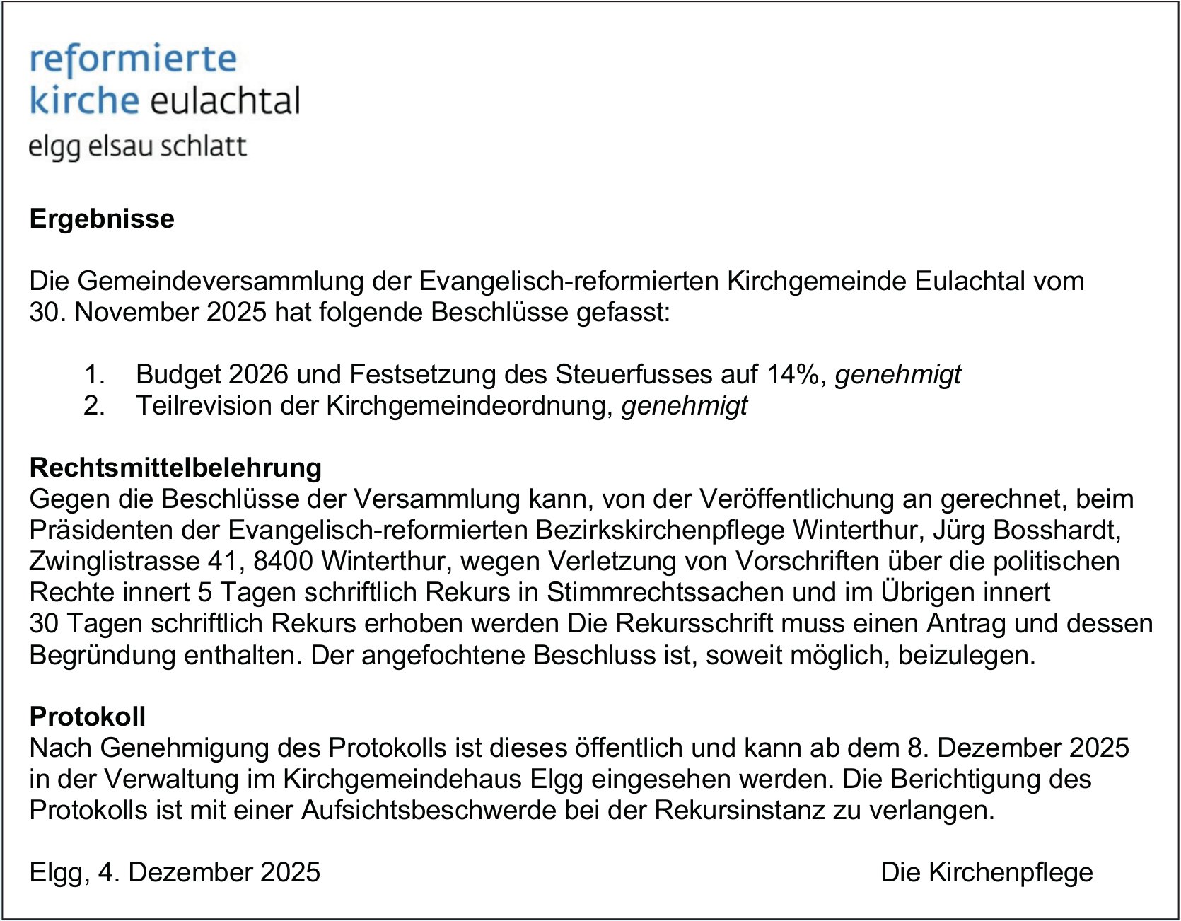 Gemeinde, Eulachtal - Reformierte Kirche, Ergebnisse der Gemeindeversammlung