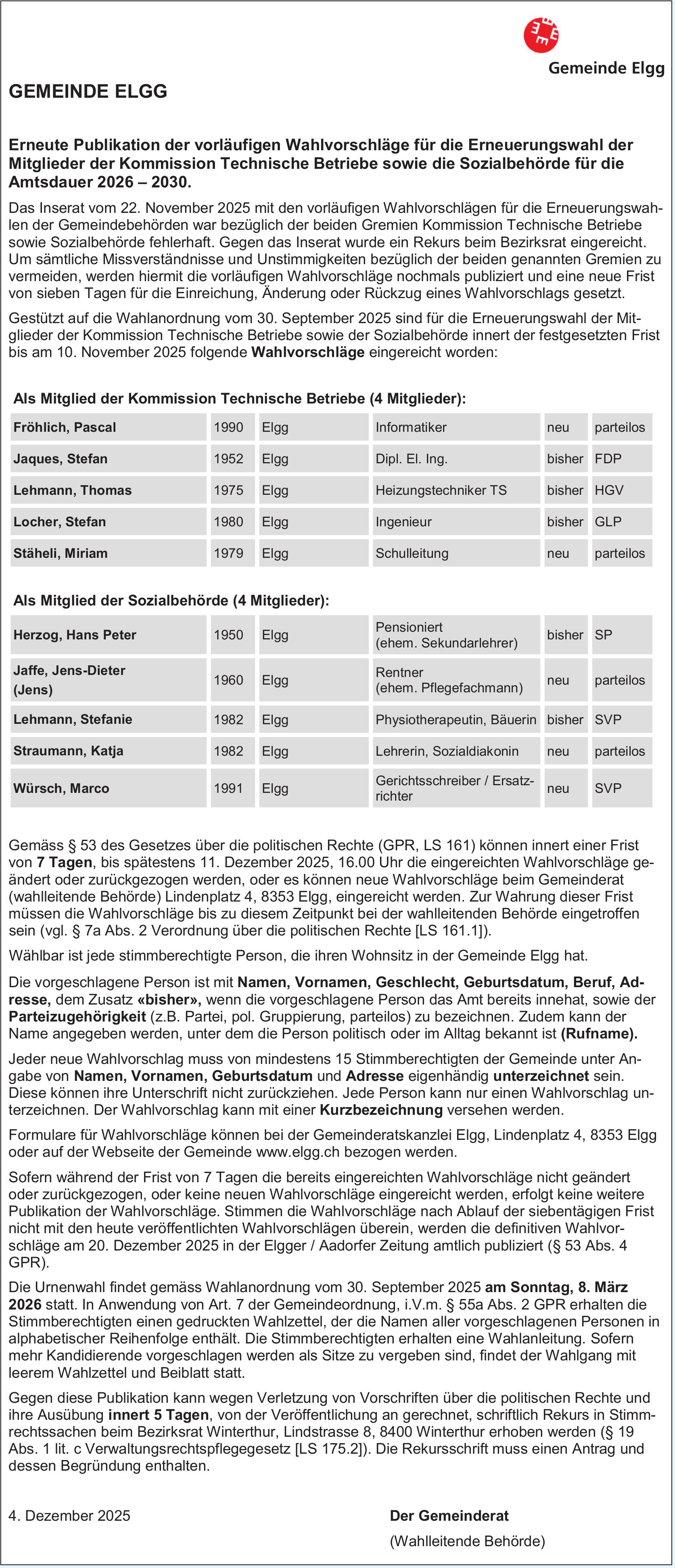 Wahlen & Abstimmungen, Elgg - Erneute Publikation der vorläufigen Wahlvorschläge für die Erneuerungswahl