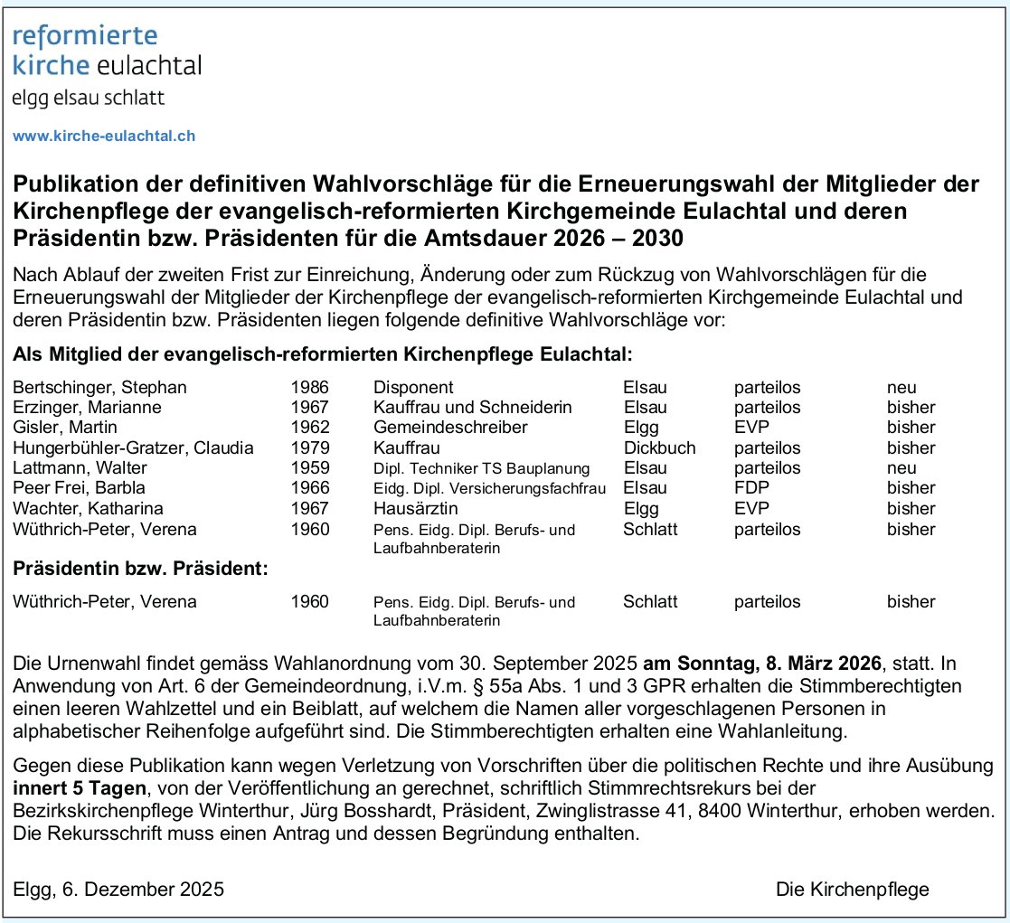 Winterthur - reformierte kirche eulachtal, Publikation der definitiven Wahlvorschläge
