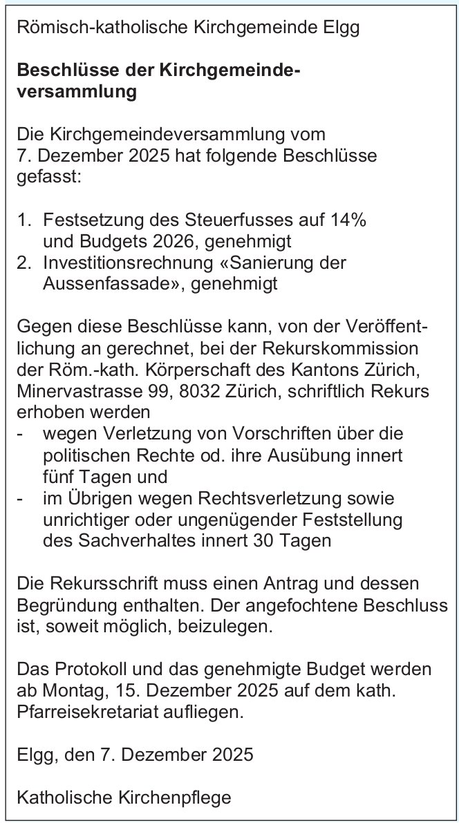Sonstiges, Zürich - Römisch-katholische Kirchgemeinde Elgg, Beschlüsse der Kirchgemeinde- versammlung