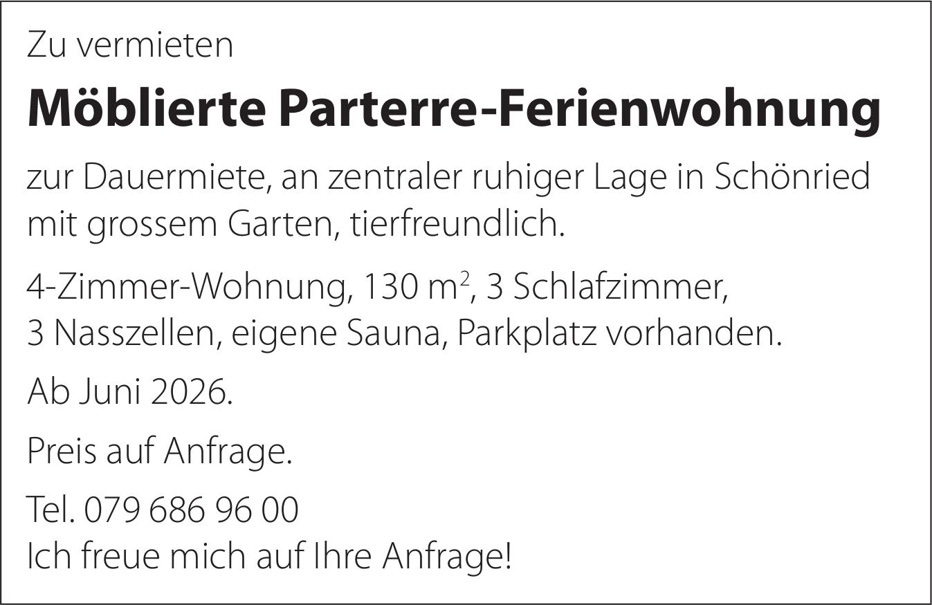Möblierte Parterre-Ferienwohnung, Schönried, zu vermieten