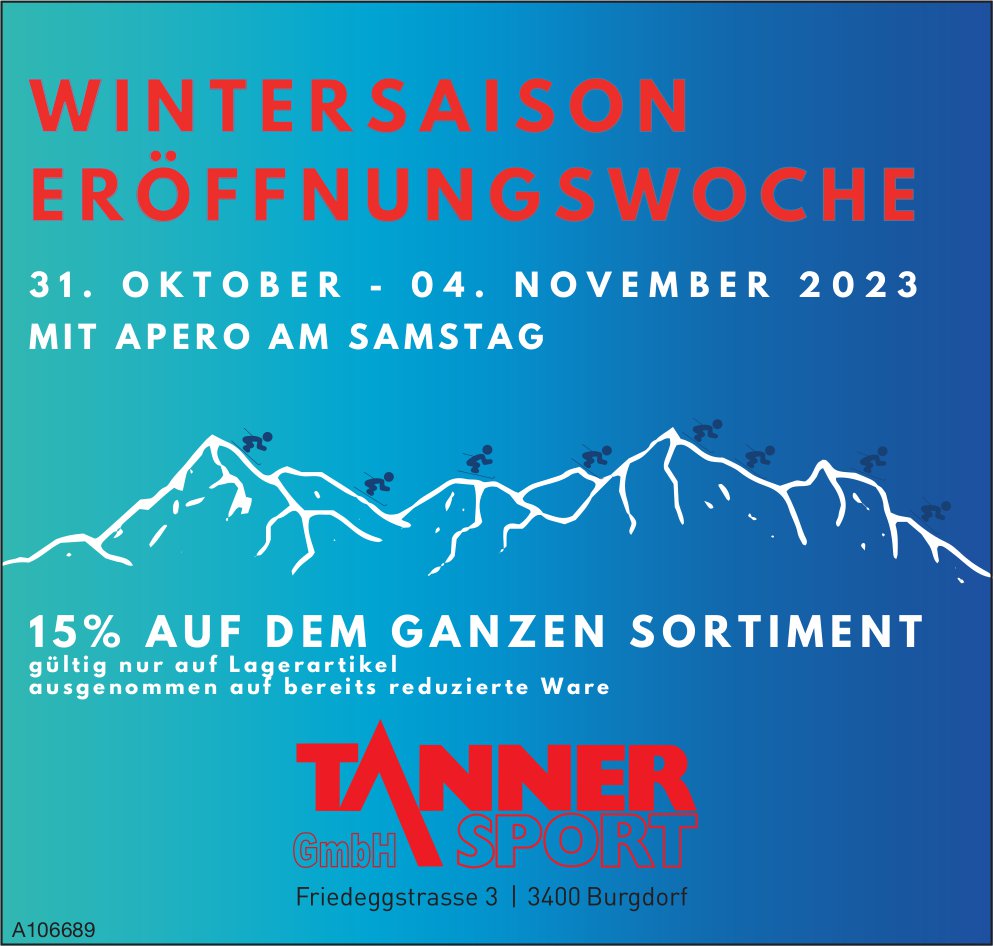 Wintersaison Eröffnungswoche, 31. Oktober bis 4. November, Tanner Sport GmbH, Burgdorf