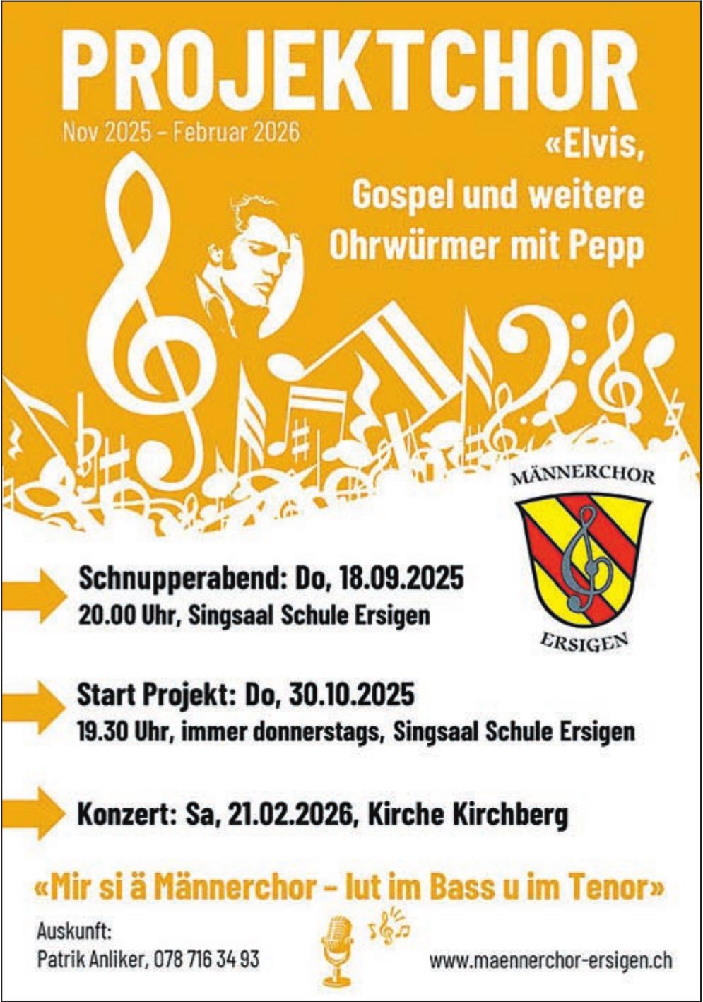 Schnupperabend Projektchor, 18. September, Singsaal Schule, Ersigen