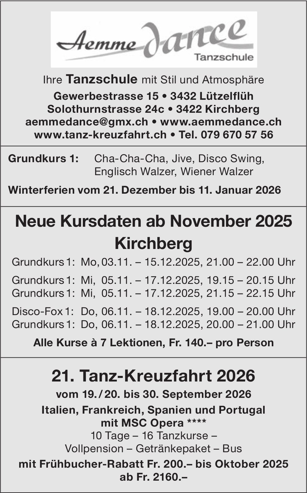 Neue Kurse ab November, 1. November, Aemme Dance, Kirchberg