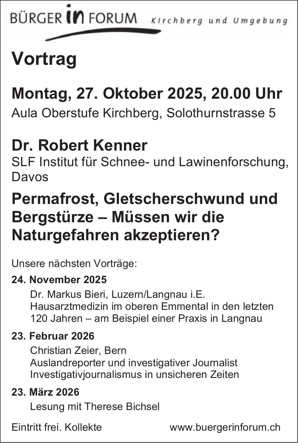 Permafrost, Gletscherschwund und Bergstürze – Müssen wir die Naturgefahren akzeptieren?, 27. Oktober, Aula Oberstufe, Kirchberg