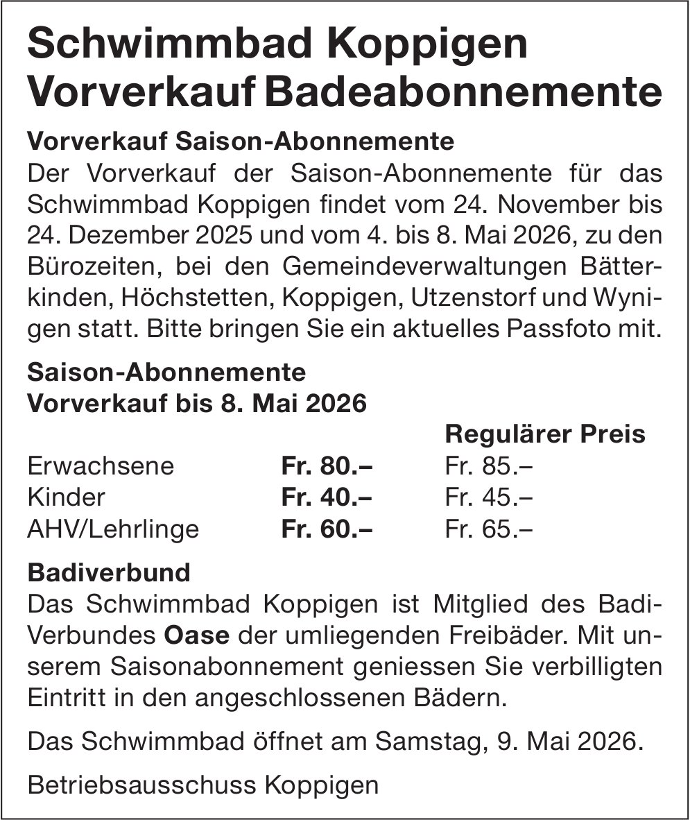 Vorverkauf Badeabonnemente, bis 8. Mai, Gemeindeverwaltung, Koppigen