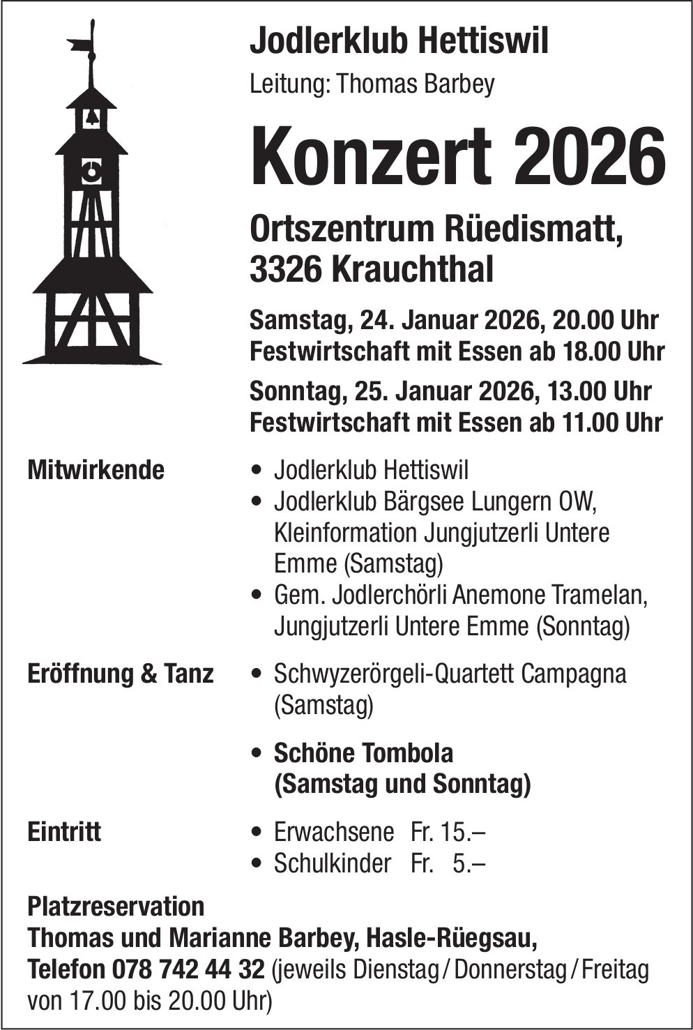 Konzert Jodlerklub Hettiswil, 24. und 25. Januar, Ortszentrum Rüedismatt, Krauchthal