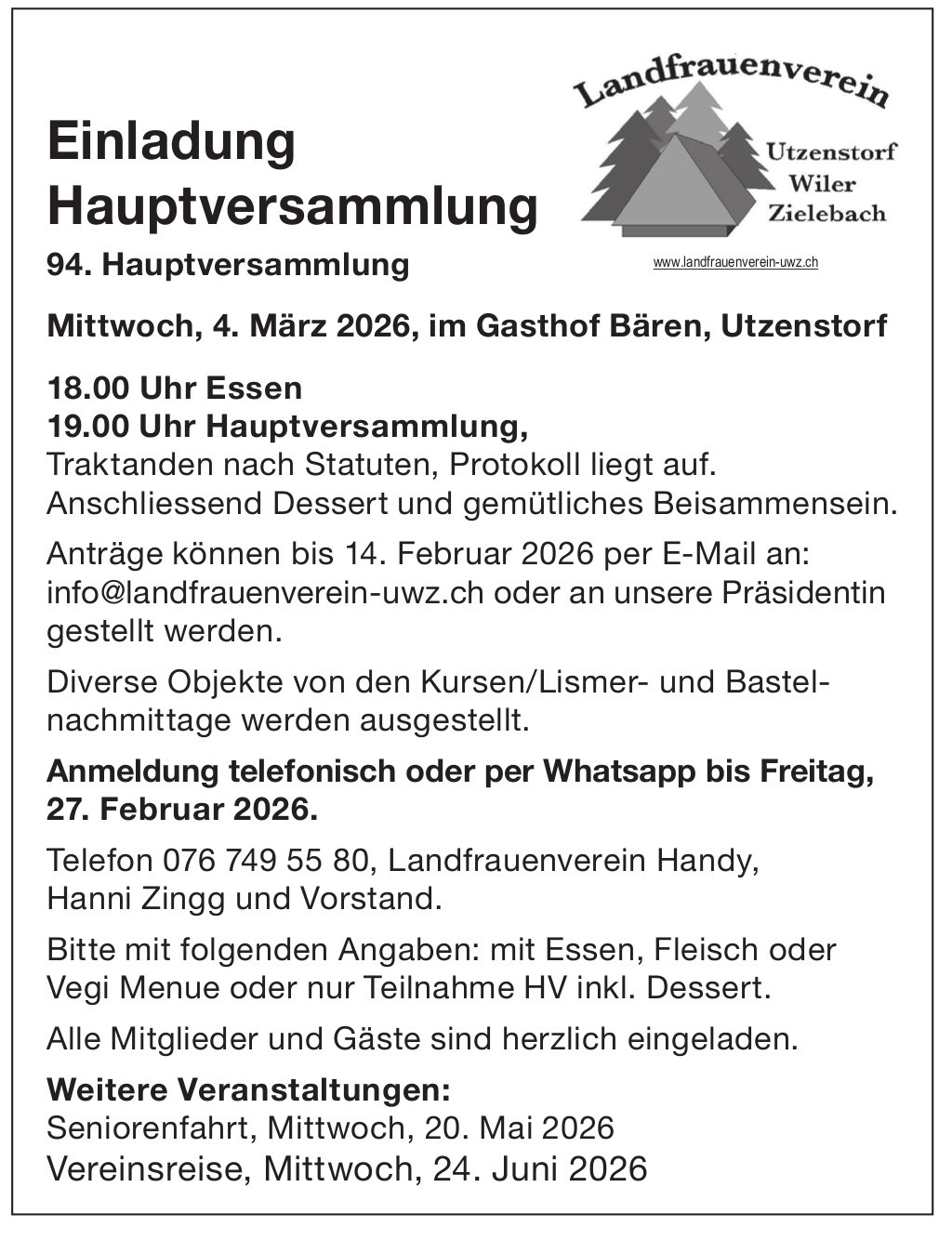 Einladung Hauptversammlung, 4. März, Gasthof Bären, Utzenstorf