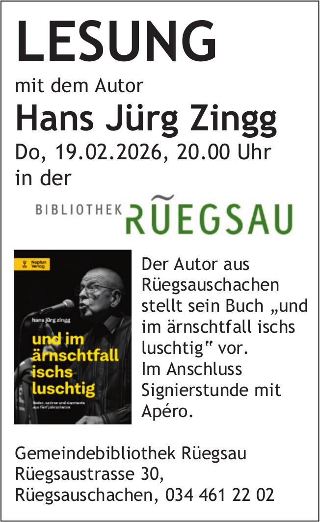 LESUNG mit dem Autor Hans Jürg Zingg, 19. Februar, BIBLIOTHEK RÜEGSAU, Rüegsauchachen