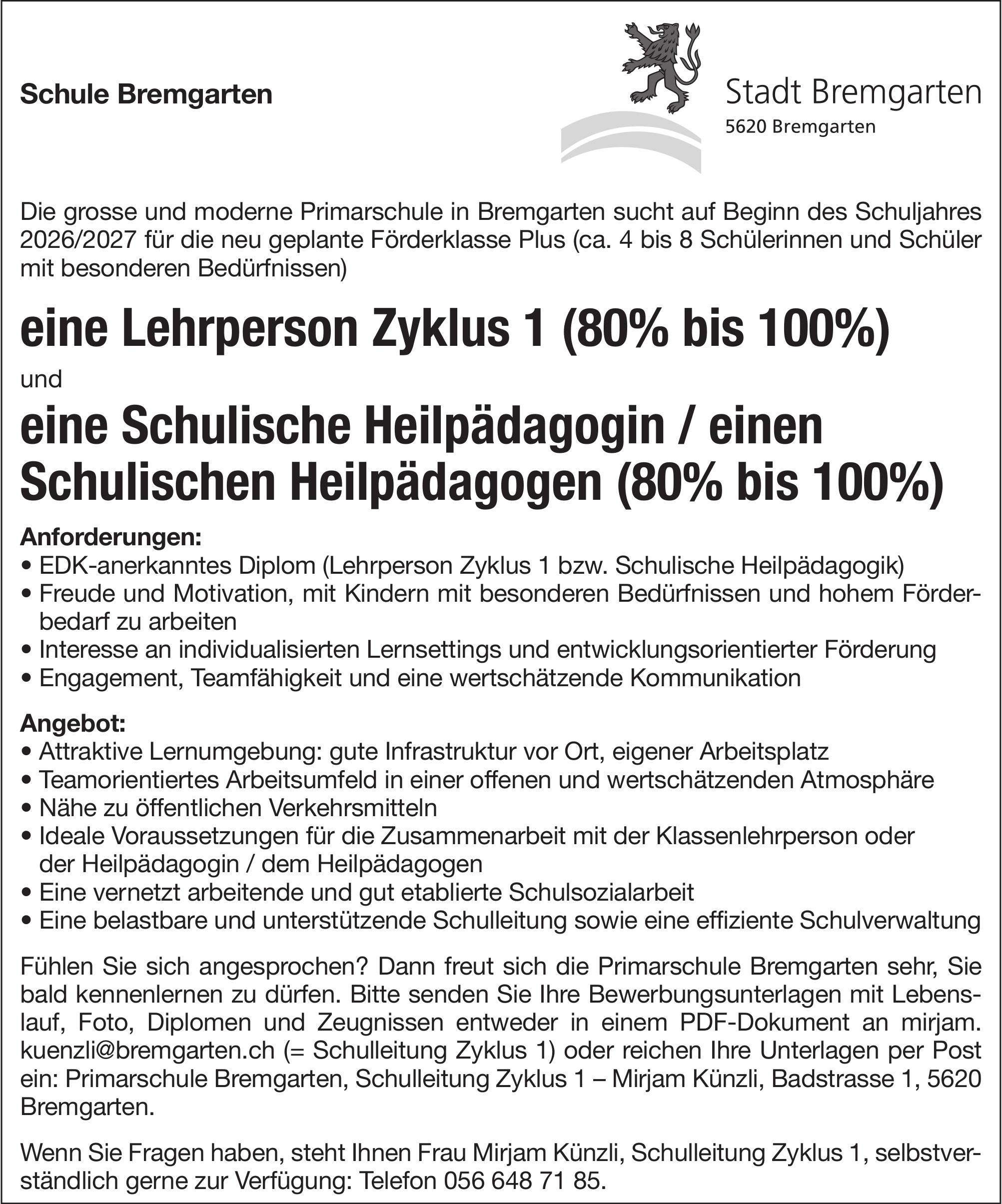 Eine Lehrperson Zyklus 1 (80% bis 100%) eine Schulische Heilpädagogin / einen Schulischen Heilpädagogen (80% bis 100%), Primarschule Bremgarten, gesucht