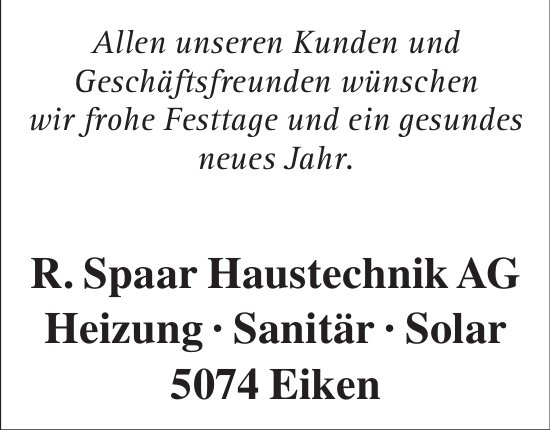 R. Spaar Haustechnik AG, Eiken - Allen unseren Kunden und Geschäftsfreunden wünschen wir frohe Festtage und ein gesundes neues Jahr.