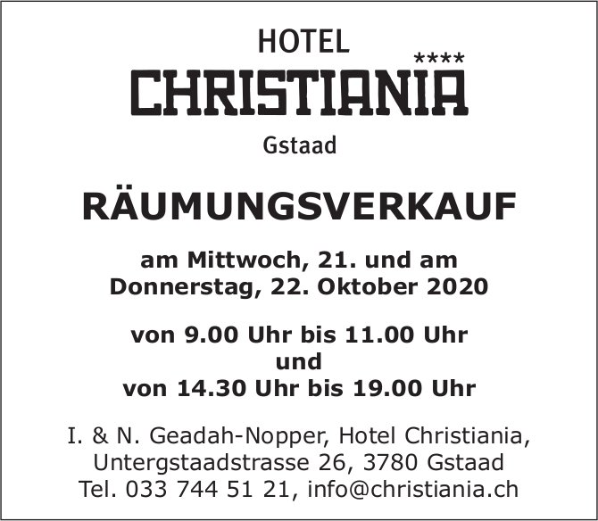 Räumungsverkauf, 21. + 22. Oktober, Hotel Christiania, Gstaad