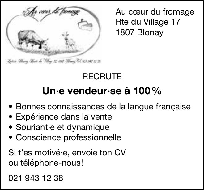 Un·e vendeur·se à 100 %, Au coeur du fromage, Blonay, recherché