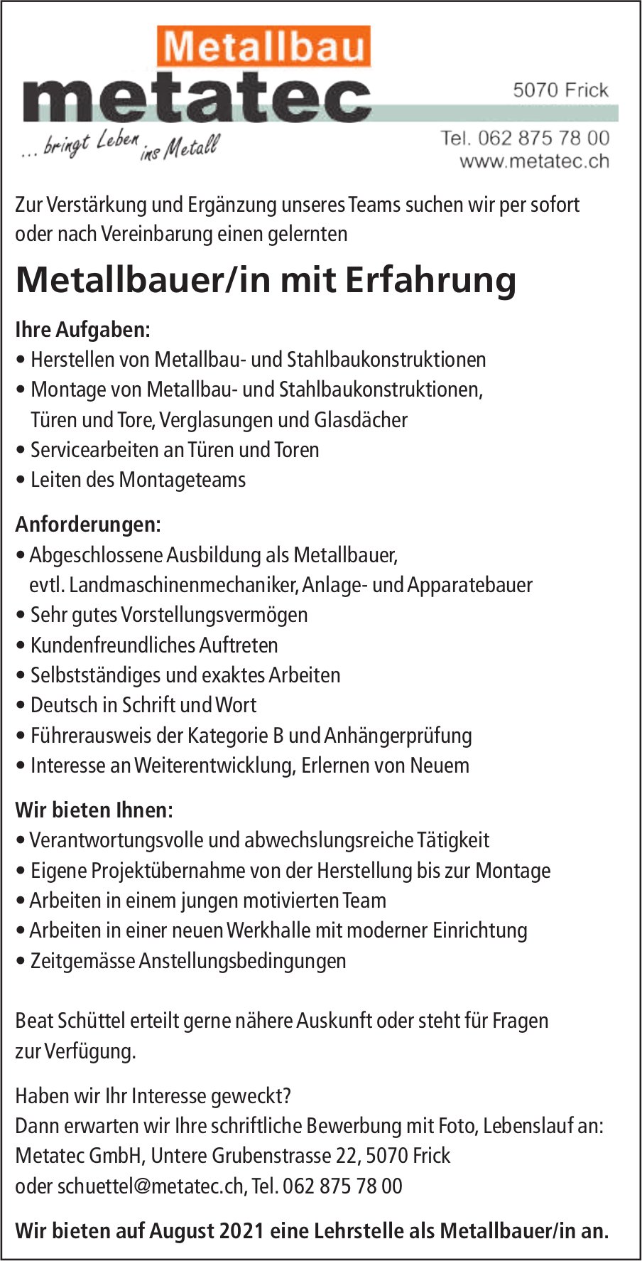 Metallbauer/in mit Erfahrung, Metatec GmbH, Frick, gesucht
