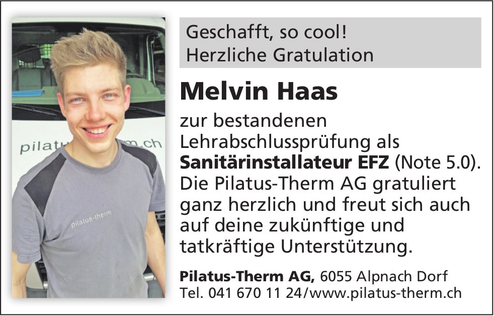 Pilatus-Therm AG, Alpnach Dorf - Herzliche Gratulation Melvin Haas zur bestandenen Lehrabschlussprüfung