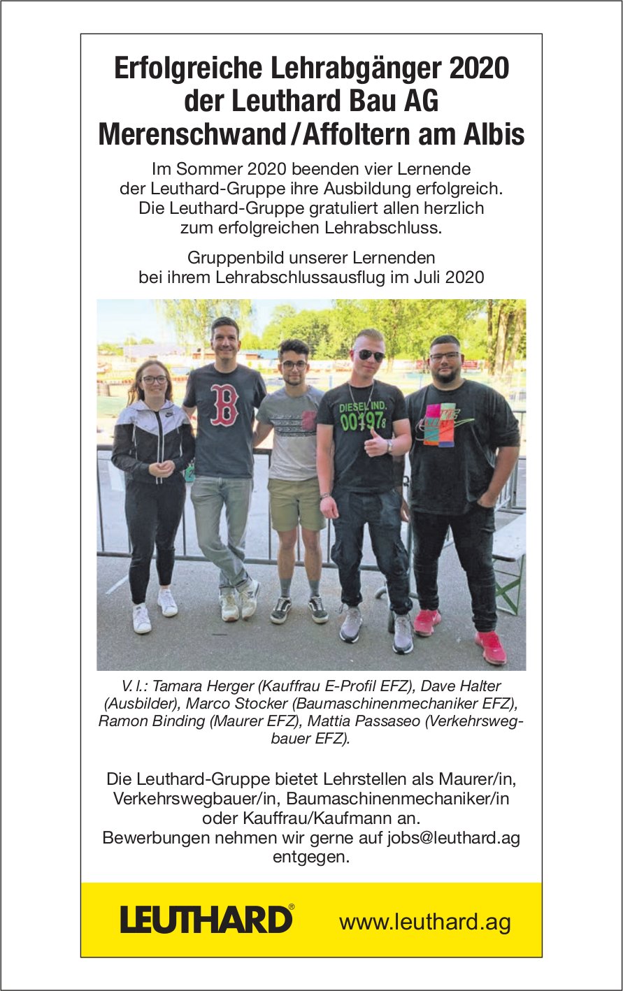 Erfolgreiche Lehrabgänger 2020 der Leuthard Bau AG Merenschwand/Affoltern am Albis
