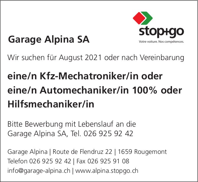 KFZ-Mechatroniker/in oder Automechaniker/in 100% oder Hilfsmechaniker/in, Garage Alpina SA, Rougemont, gesucht