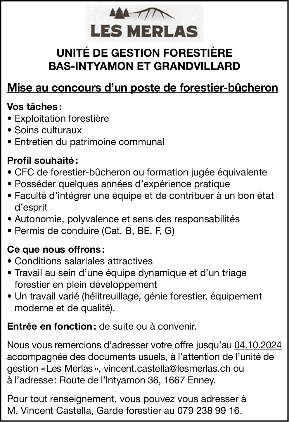 Forestier-bûcheron, Les Merlas, Unité de Gestion forestière Bas-Intyamon et Grandvillard, Enney, recherché-e